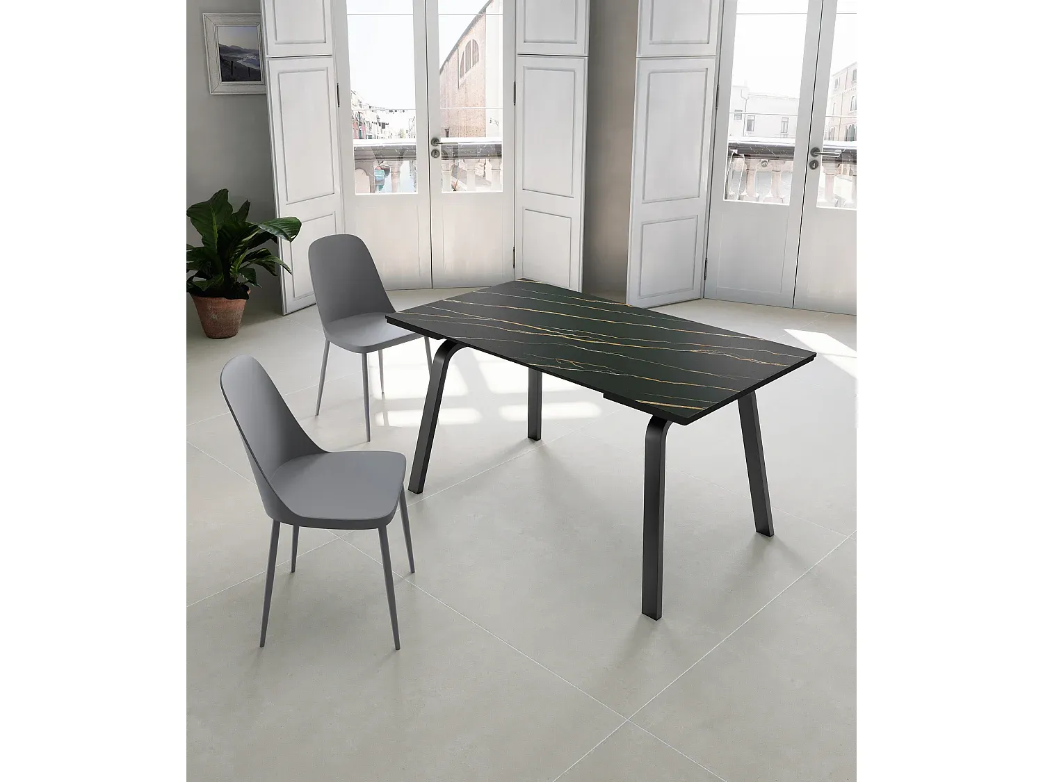 Ausziehbarer Tisch mit einer Größe von 140/200 x 80 cm. Die Tischplatte besteht aus schwarzer Marmorkeramik. Die Tischfüße sind aus Metall gefertigt und haben eine anthrazitfarbene Oberfläche.