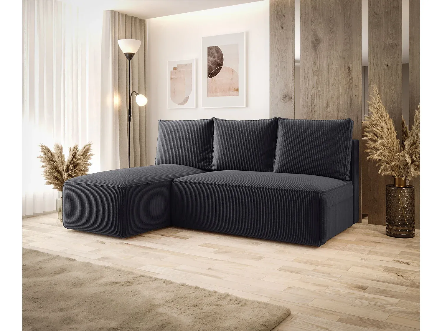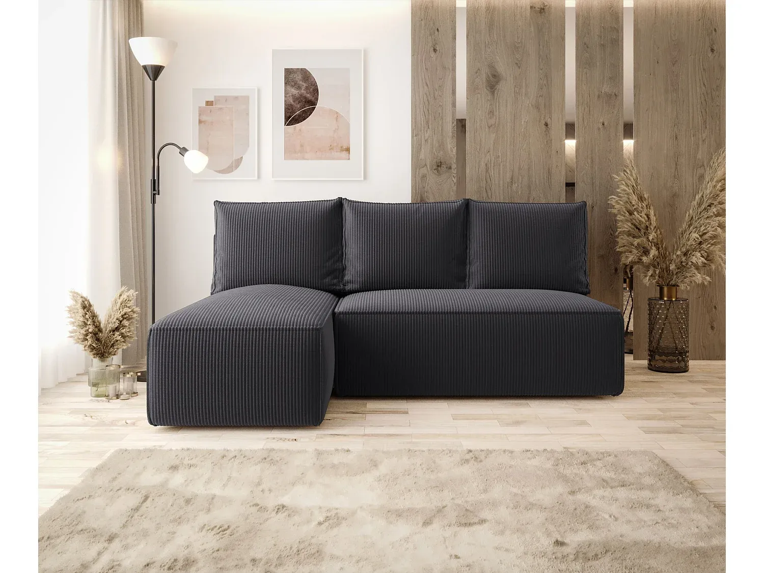 Das Ecksofa bietet eine Kombination aus Komfort und Funktionalität und passt sich harmonisch in verschiedene Wohnbereiche ein. Dank der freistehenden Konstruktion ist das Sofa rundum mit Poso-Stoff bezogen. Der Stoff ist bekannt für seine sanfte Haptik und Widerstandskraft. Die Sitzfläche mit T30-Schaum und Wellenfederung sorgt für Komfort und notwendige Unterstützung. Mit wenigen Handgriffen kann das Sofa in eine Schlaffläche umgewandelt werden. Der integrierte Stauraum dient zur praktischen Aufbewahrung von Bettwäsche, Decken oder Kissen. Der Rahmen aus Massivholz und Spanplatte bietet eine stabile Basis. Die Maße sind mit einer Toleranz von +/-3 % angegeben. Farbabweichungen durch Bildschirmdarstellung möglich.