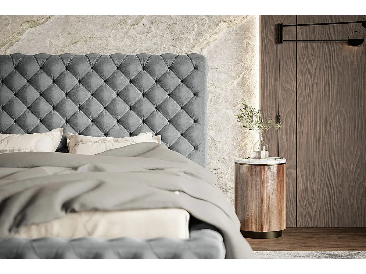 Das Polsterbett bietet eine attraktive Gestaltung für das Schlafzimmer. Mit einem hohen Kopfteil bietet es Unterstützung beim Lesen oder Entspannen. Die durchgehende Steppung ist ein markantes Merkmal. Information: Chrombeine, inklusive Lattenrost und Bettkasten.