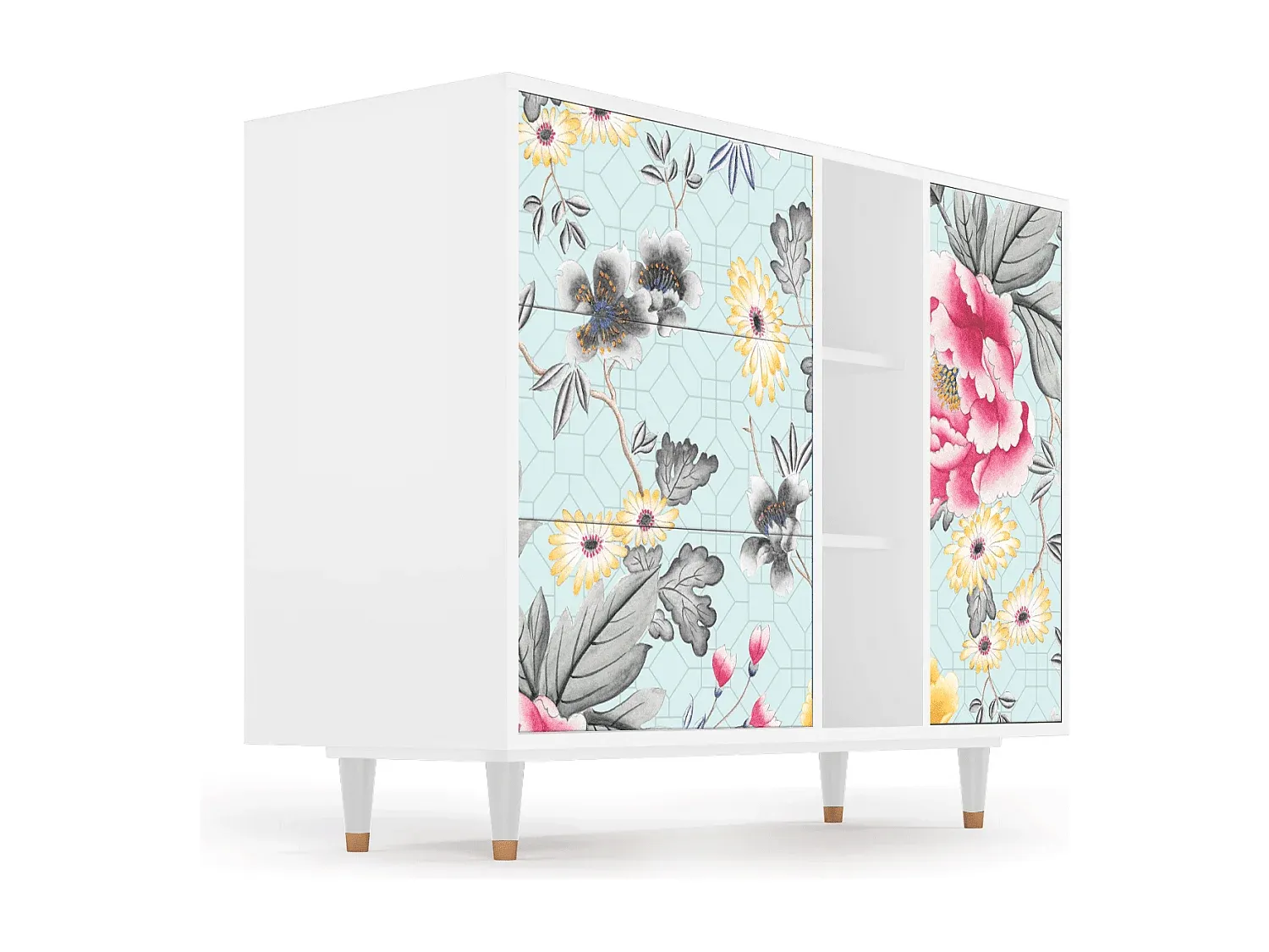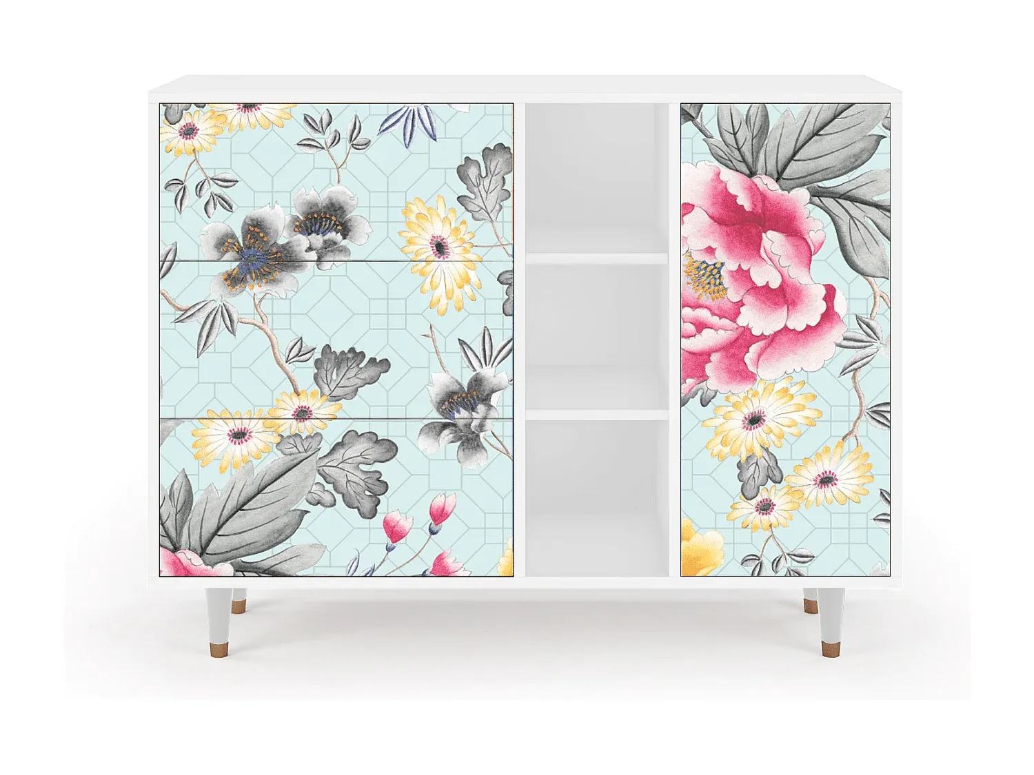 Moderner Stil und funktionales Design vereinen sich in diesem vielseitigen Sideboard. Es bietet ausreichend Stauraum für ein organisiertes Zuhause und zeichnet sich durch klare Linien und eine hochwertige Verarbeitung aus. Die Kombination aus Holz und Metalleinsätzen sorgt für Stabilität und ein ansprechendes Aussehen. Die Fronten sind UV-bedruckt und mit Schutzlack versiegelt, was Langlebigkeit und Widerstandsfähigkeit gewährleistet. Der Push-to-Open-Mechanismus ermöglicht eine grifffreie Optik. Mit seiner Anpassungsfähigkeit passt es sich unterschiedlichen Einrichtungsstilen an. Maße: Breite: 125 cm, Höhe: 98 cm, Tiefe: 48 cm. Materialangaben: Holzplatte und Derivate, Holzspan, Laminat-Finish.