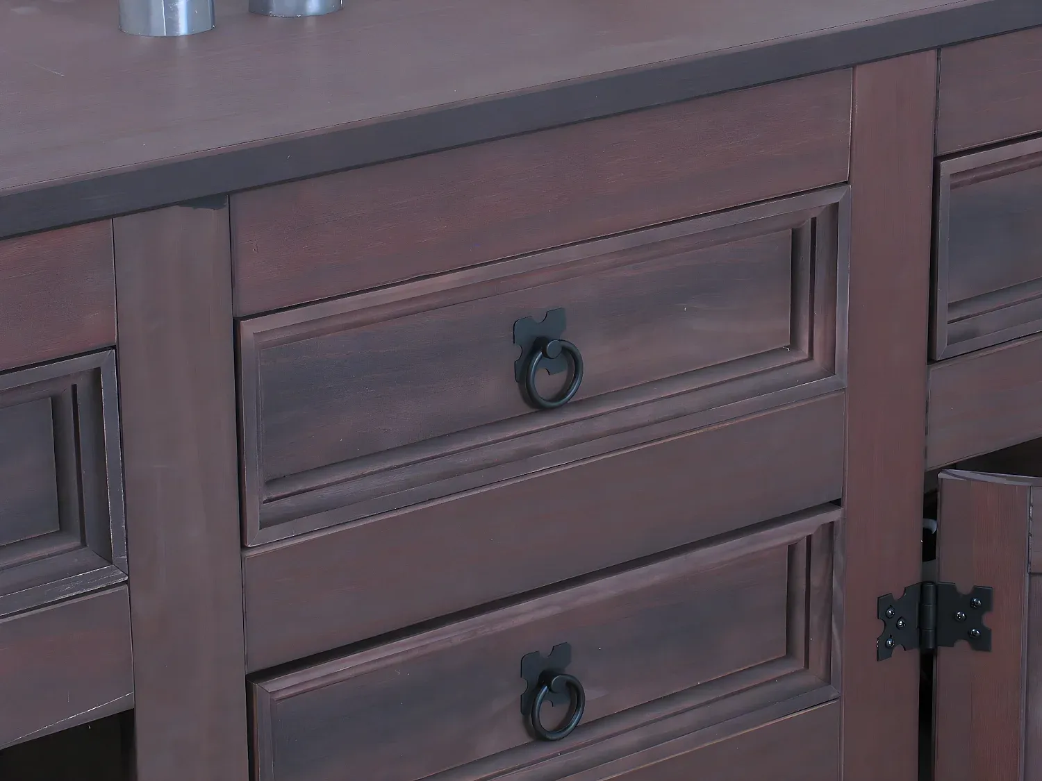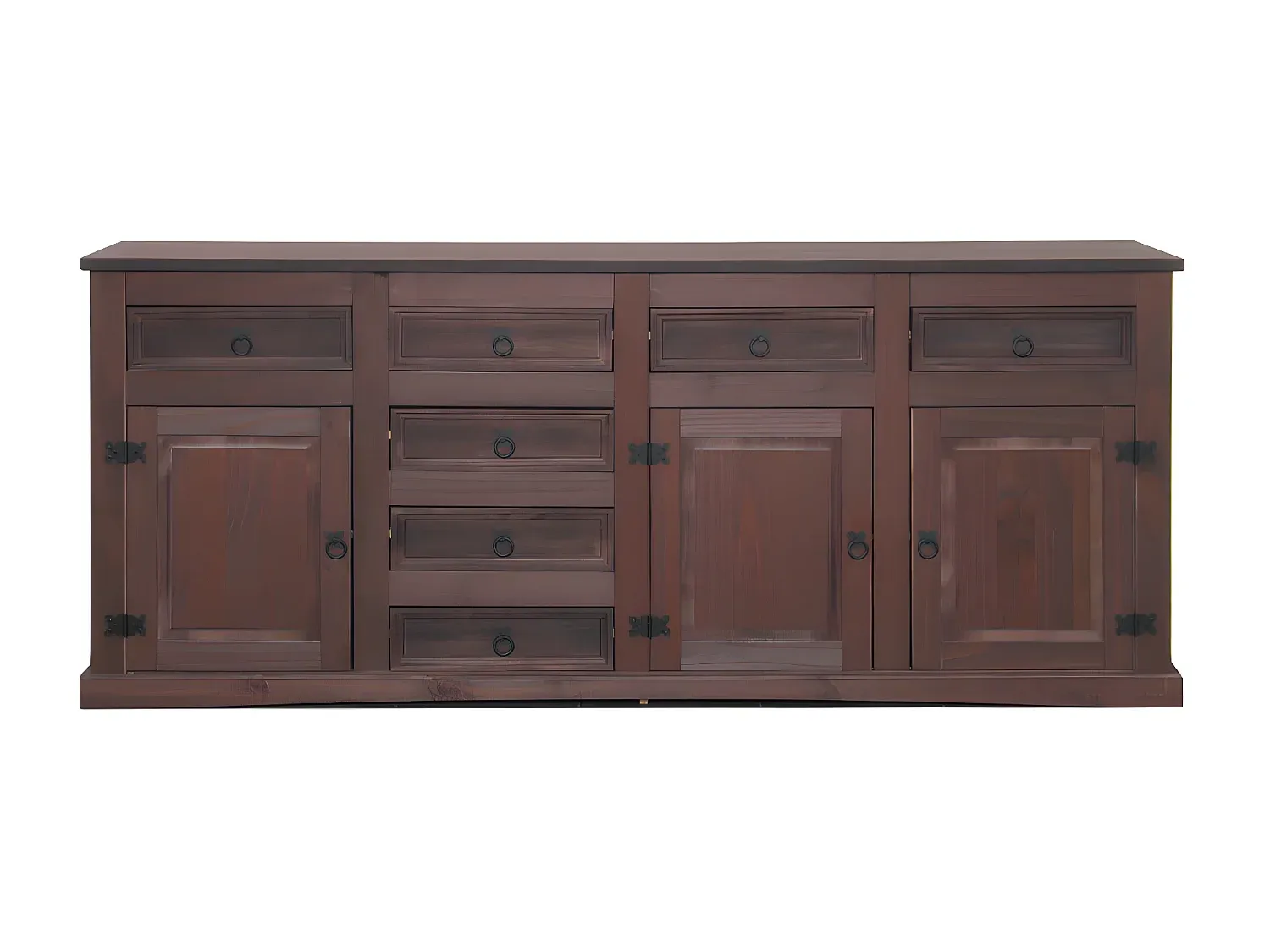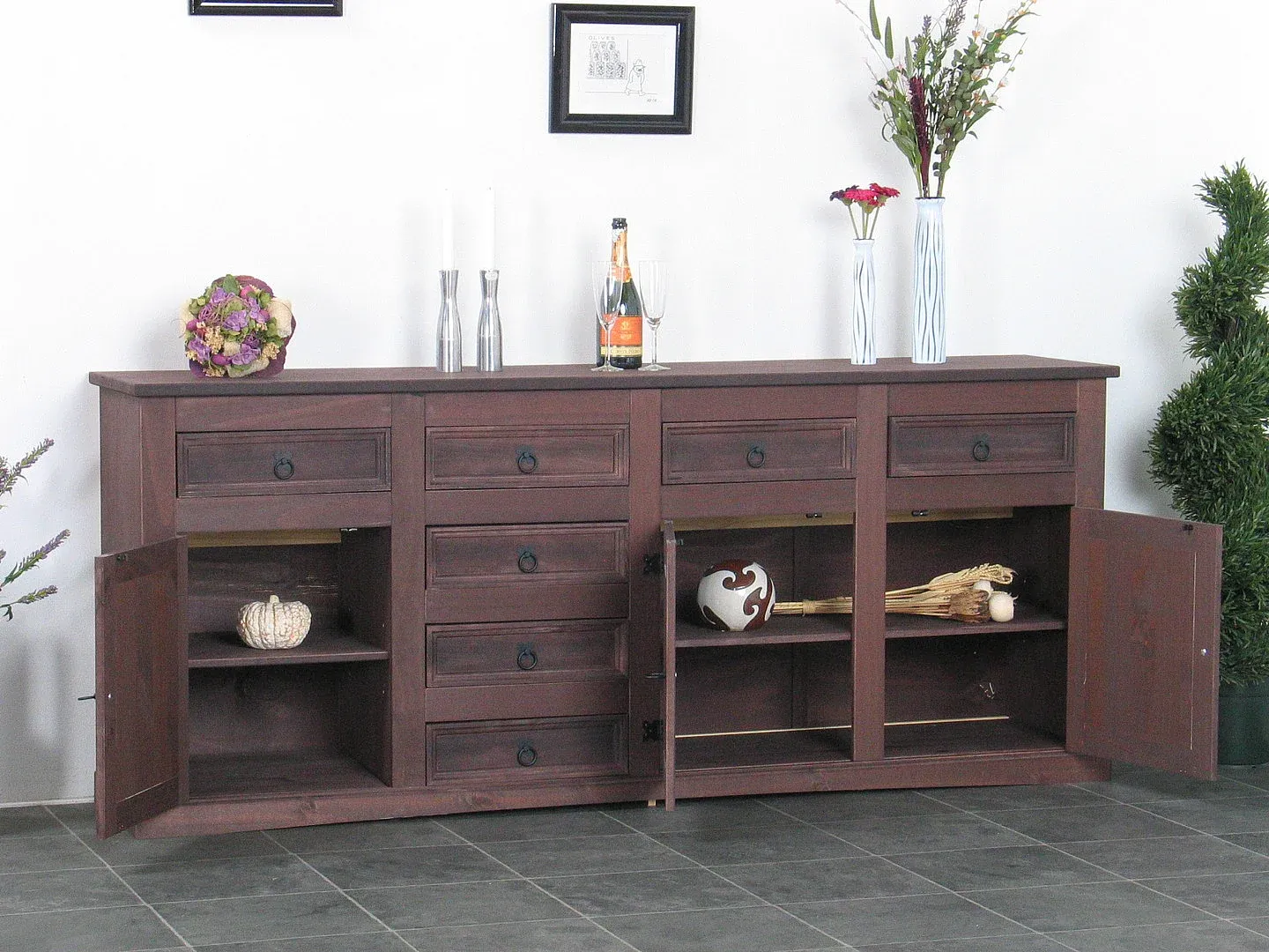 Das Sideboard verfügt über 7 Schubladen und 3 Türen. Hinter den Türen befindet sich ein durchgehendes Regal, ein loses Regal ist hinter der linken Tür. Durch die braune Farbgebung ist die Holzstruktur erkennbar.