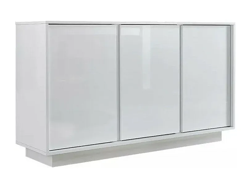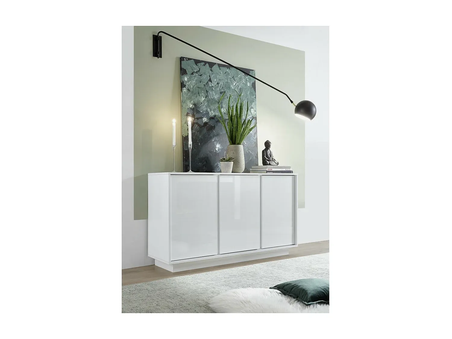 Sideboard mit drei Türen in glänzendem Weißlack, geeignet für Wohn- oder Esszimmer. Abmessungen: L137 x H78 x P43 cm. Es bietet Stauraum mit drei Flügeltüren. Die Oberfläche ist leicht mit einem feuchten Mikrofasertuch zu reinigen. Enthält eine Anleitung für den einfachen Aufbau.