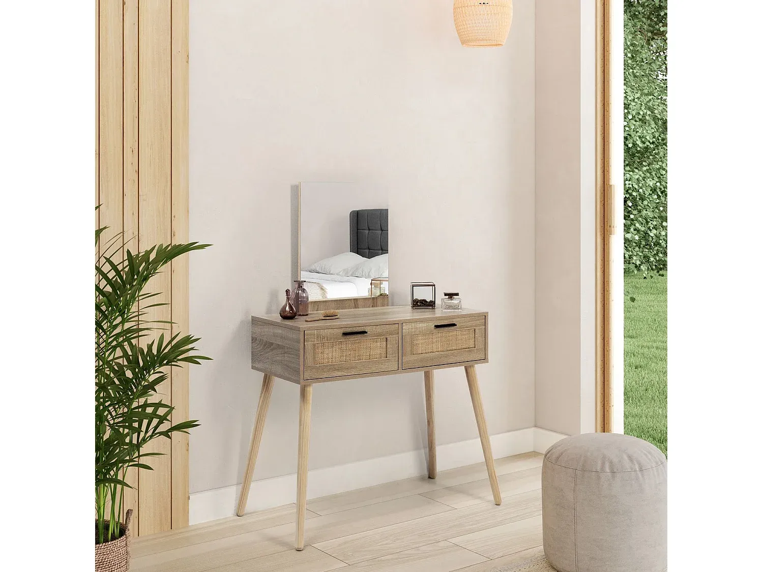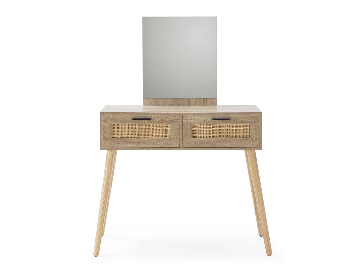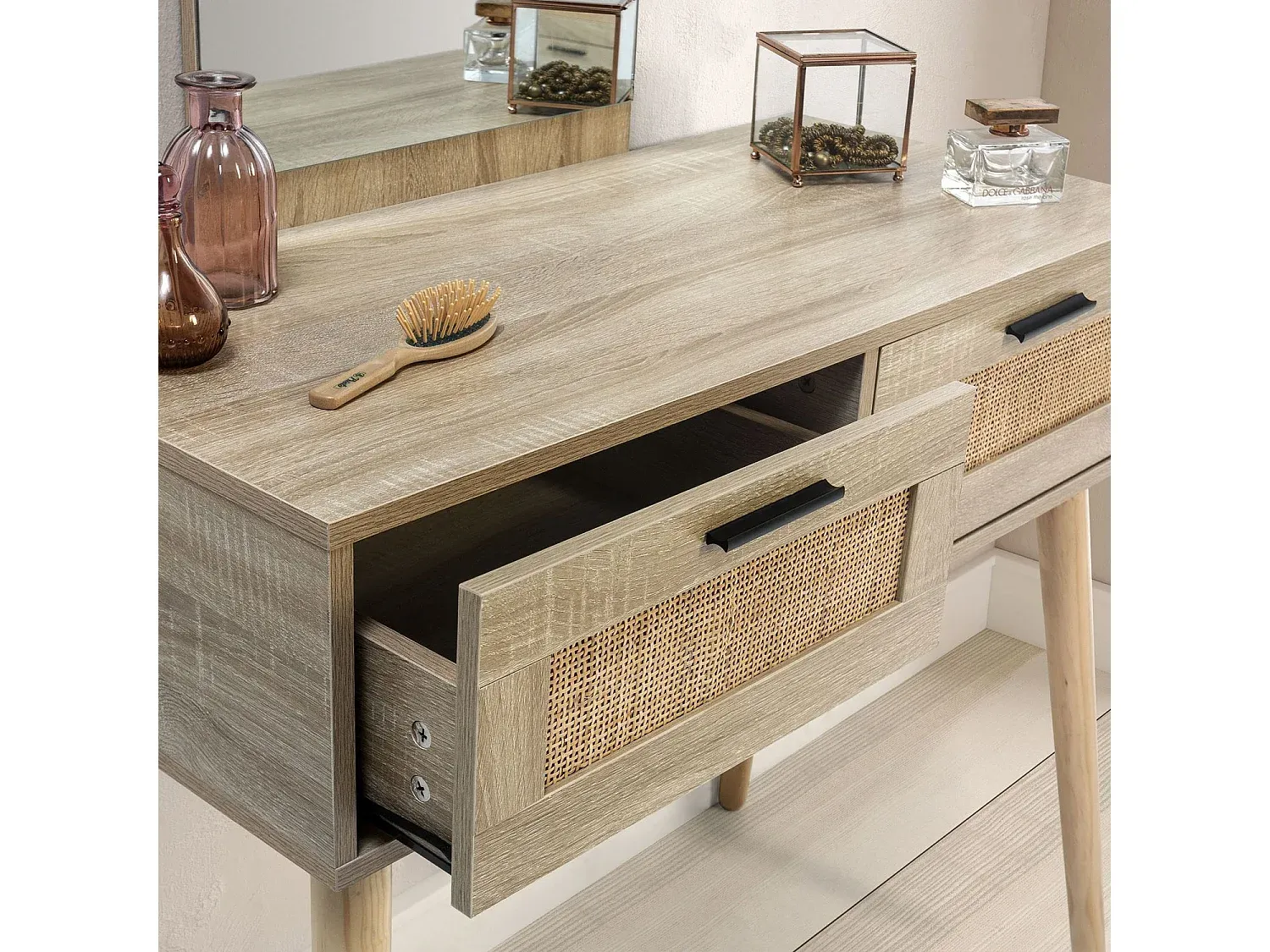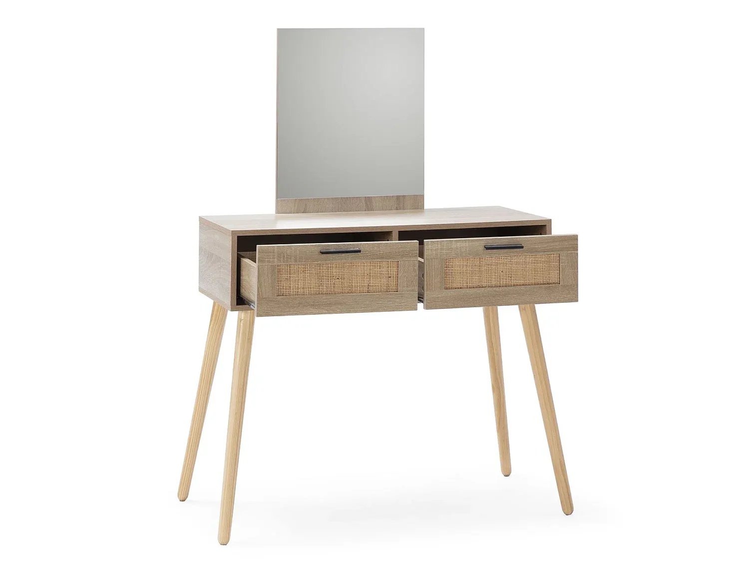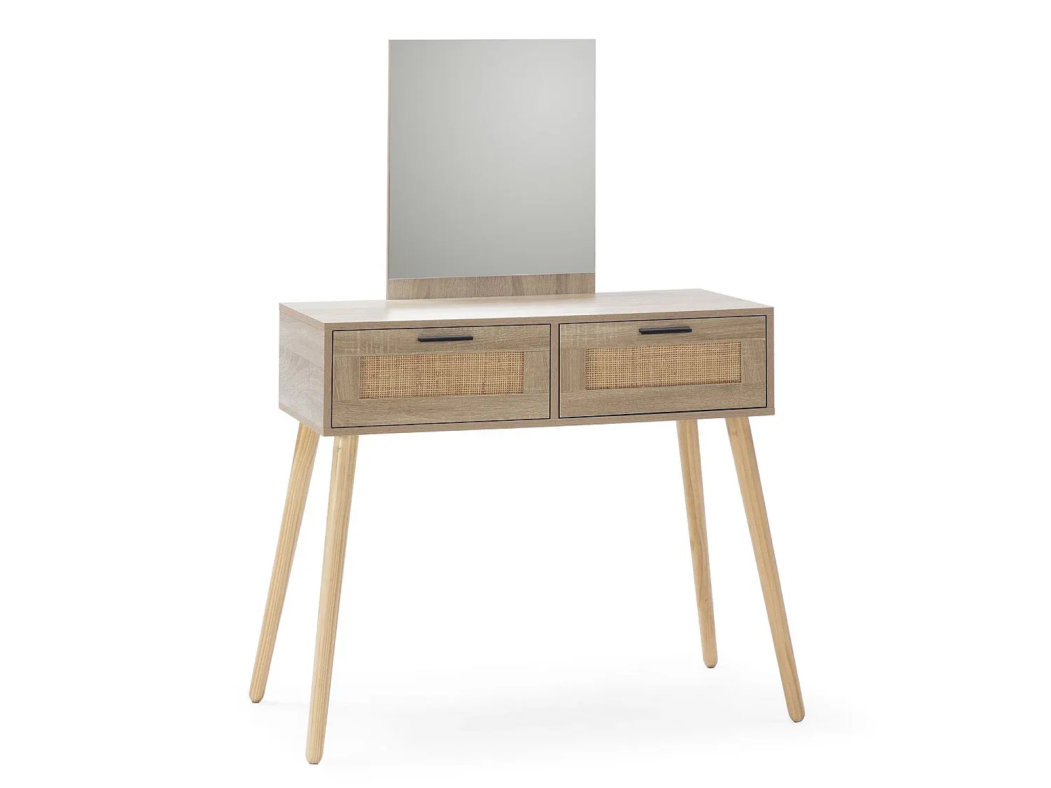 Dieses Möbelstück im Rattan-Stil eignet sich zur Dekoration des Flurs oder als Schminktisch im Schlafzimmer mit einem Stuhl oder Hocker. Hergestellt aus Melamin, kombiniert mit einer natürlichen Rattanfront, bietet es einen subtilen Kontrast zur Struktur in Eichenholzfarbe. Es besitzt einen rahmenlosen Spiegel. Die Schubladen sind mit Metallführungen ausgestattet für einfaches Öffnen und Schließen und verfügen über schwarze Griffe. Die Montage erfolgt anhand einer ausführlichen Anleitung.