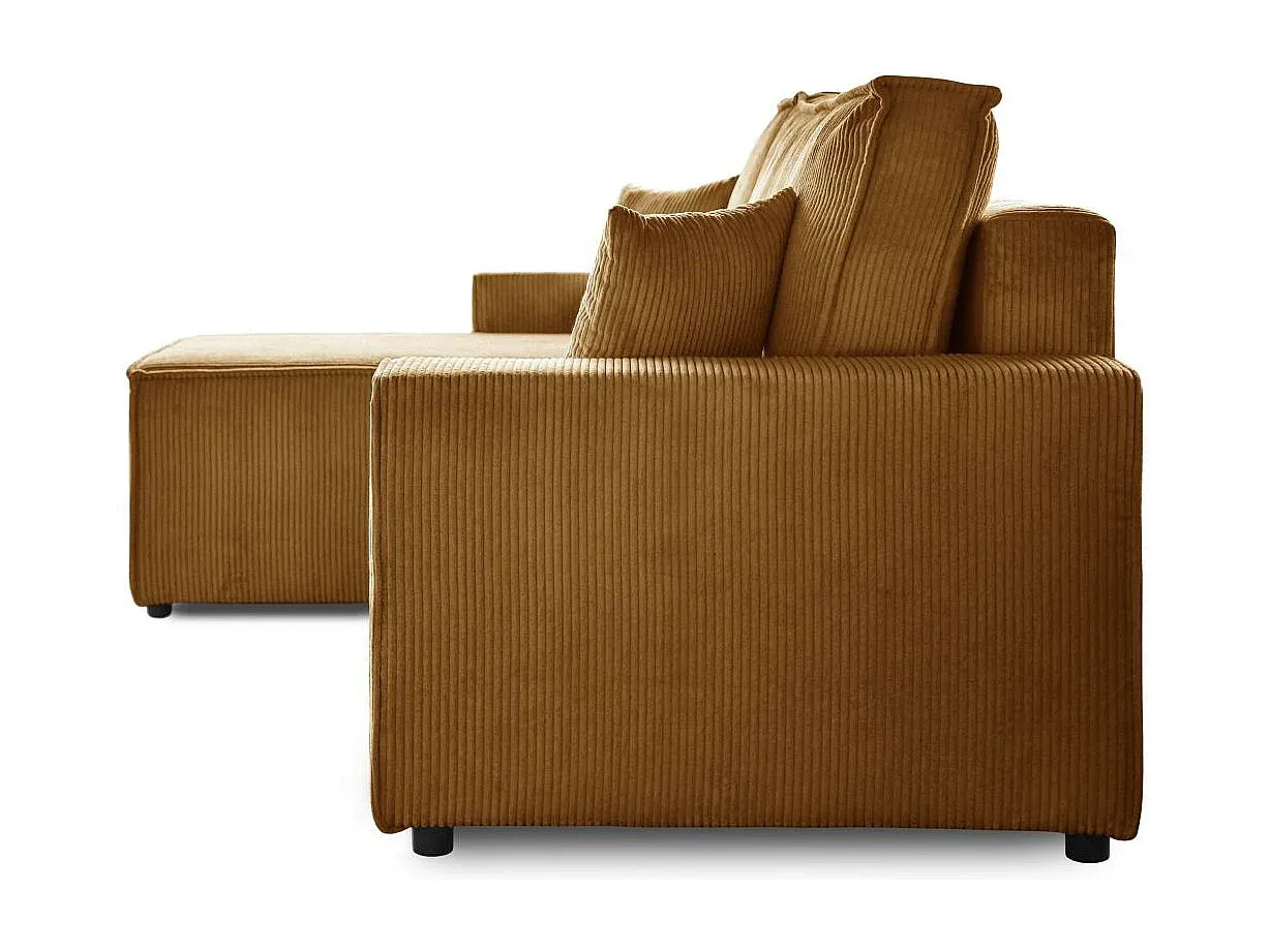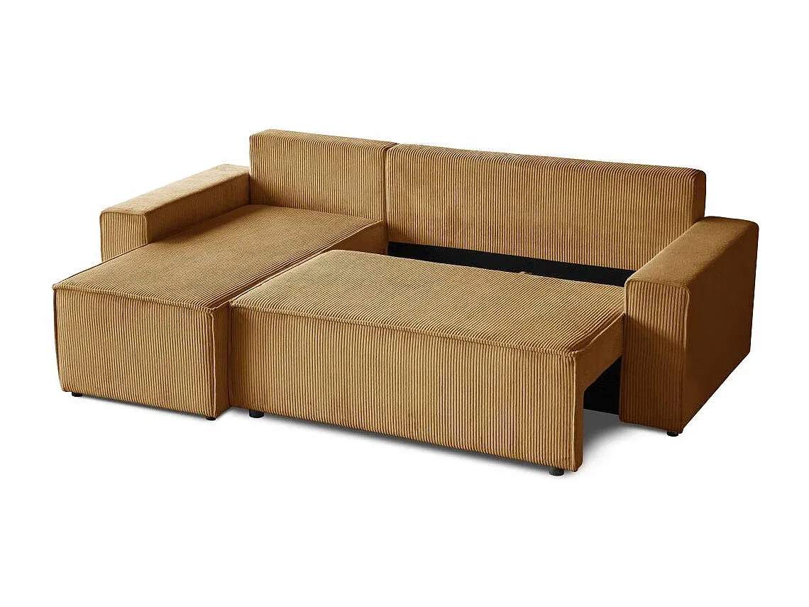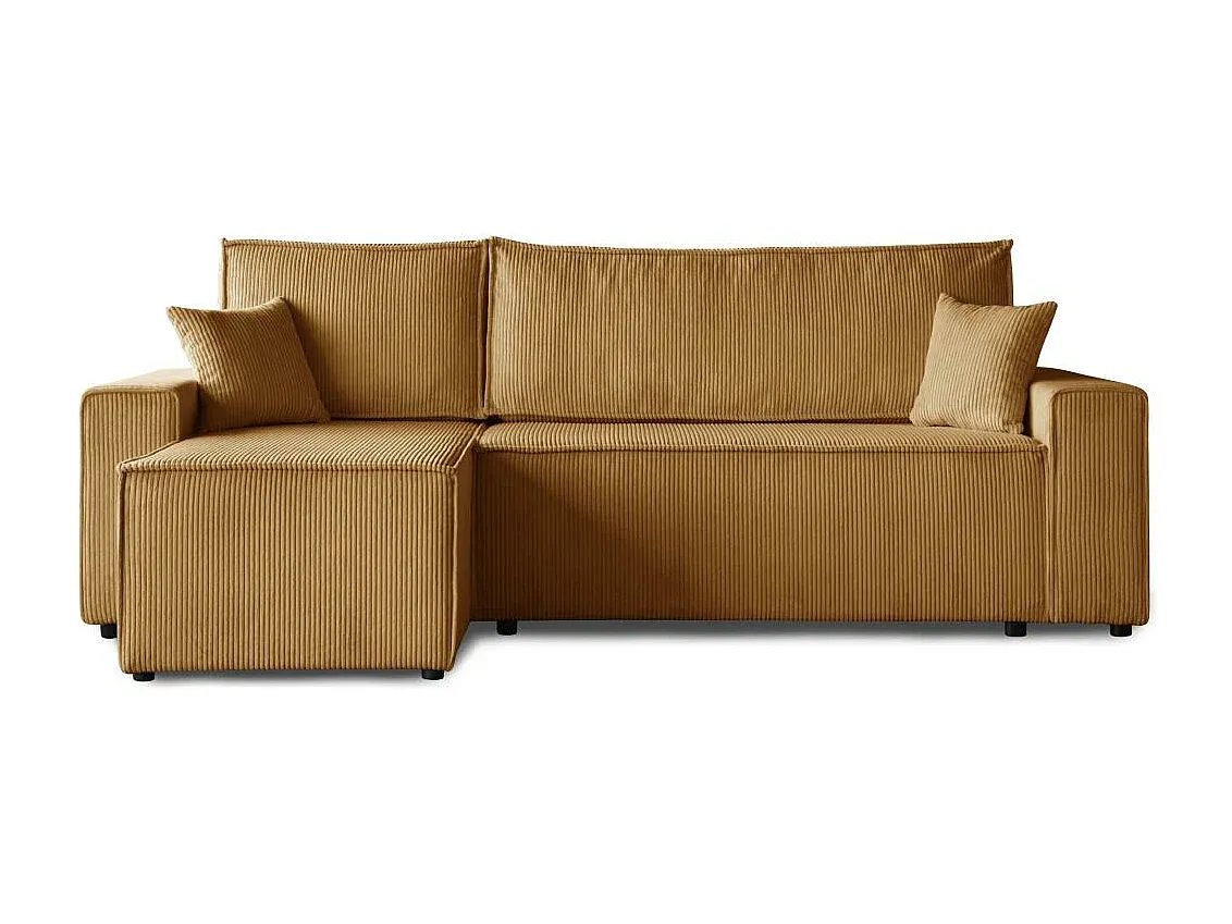 Das Ecksofa bietet Funktionalität und vielseitigen Einsatz in modernen Wohnräumen. Die L-Form sorgt für optimale Platzausnutzung und bietet Raum zum Sitzen und Entspannen. Hergestellt aus einer stabilen Möbelplatte, bietet es Widerstandsfähigkeit, während die gepolsterte Sitzfläche mit Bonnell-Federn für Komfort und gleichmäßigen Halt sorgt. Das Sofa kann leicht in eine Schlafgelegenheit umgewandelt werden. Die Ottomane ist anpassbar auf der rechten oder linken Seite und in zwei Breiten erhältlich. Zwei Rückenkissen bieten zusätzlichen Komfort. Praktischerweise verfügt das Sofa über einen integrierten Bettkasten für Stauraum. Der POSO-Stoff zeichnet sich durch weiche Haptik und pflegeleichte Eigenschaften aus. Die polsterte Rückseite erlaubt freie Platzierung im Raum. Mit den Maßen 247 cm oder 277 cm in der Breite, 94 cm in der Höhe und 152 cm in der Tiefe kann es sich verschiedenen Raumgrößen anpassen. Die Liegefläche beträgt je nach Wahl 203×125 cm oder 233×125 cm.
