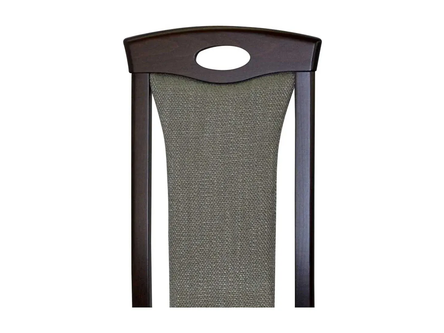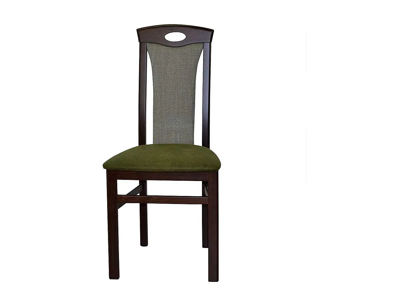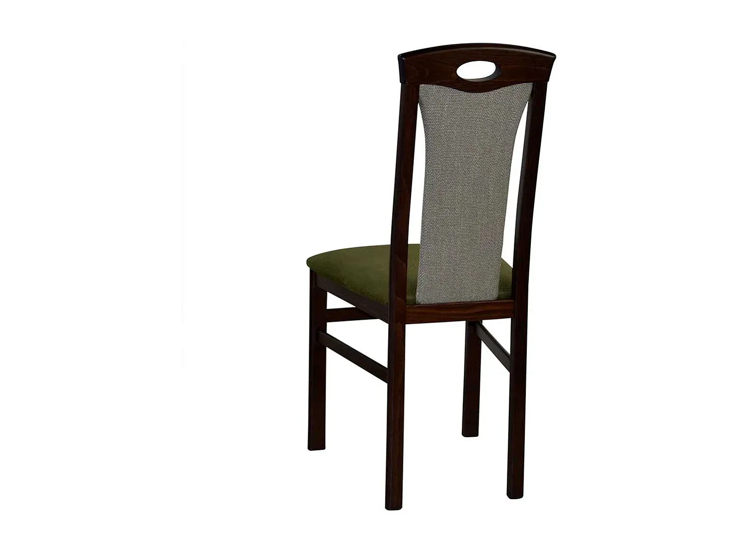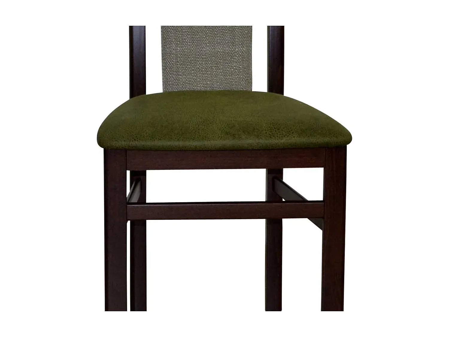 Essstühle in Nussbaumfarben und Grün. Diese Stühle bieten eine gepolsterte Rückenlehne und ein modernes Design. Die Sitzhöhe beträgt 46 cm, die Sitztiefe 40 cm. Das Material kombiniert Buche Massivholz mit Kunstleder und Webstoff. Maße des Stuhls sind 45 cm in der Breite, 95 cm in der Höhe und 48 cm in der Tiefe.