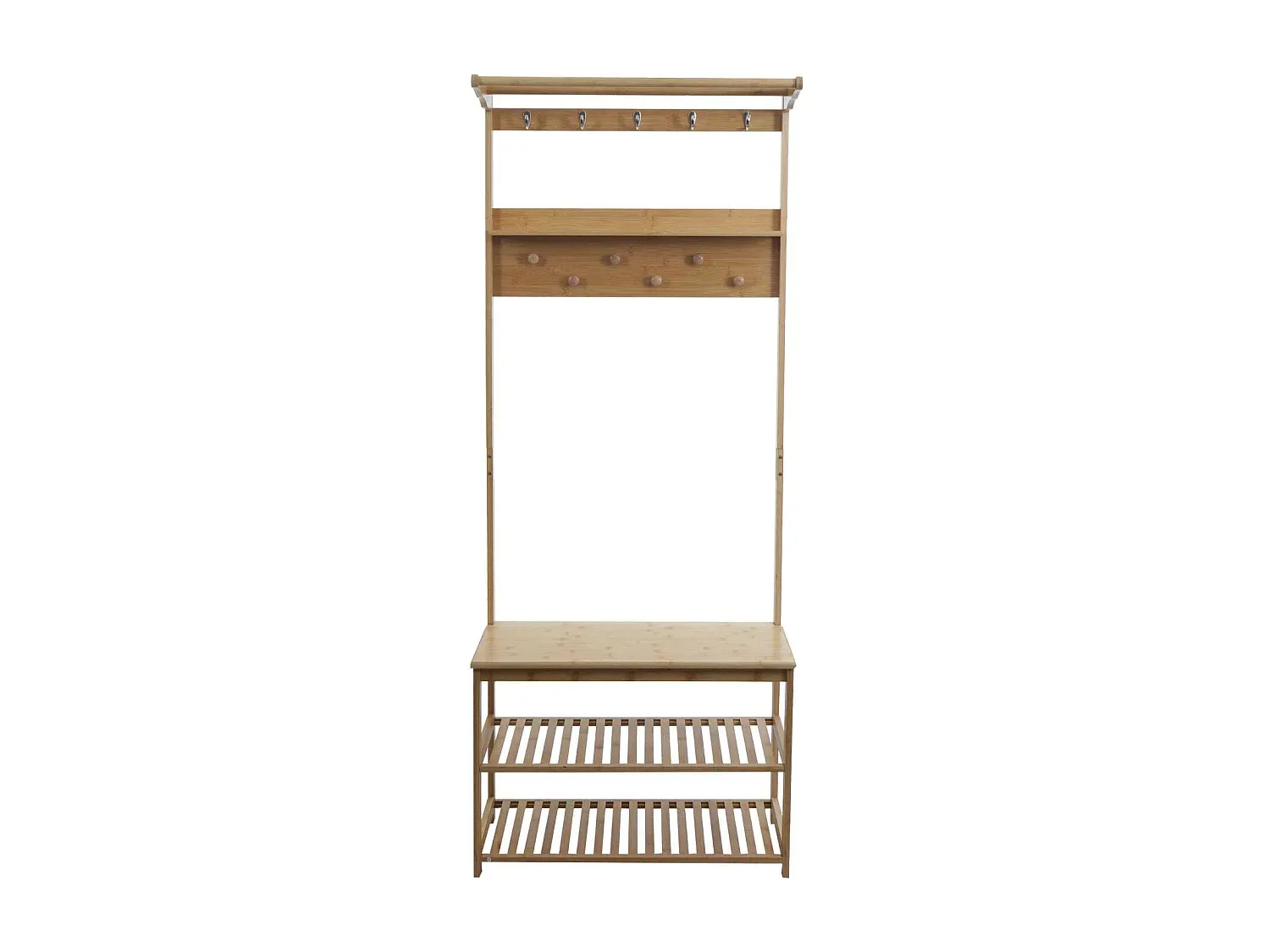 Die Standgarderobe aus Bambus bietet eine Sitzfläche, zwei Ablagefächer für Schuhe, eine Hutablage und eine Schlüsselablage. Mit fünf Kleiderhaken und sechs Garderobenknöpfen sorgt sie für Ordnung und Platz für Jacken, Mäntel und Accessoires. Das Design passt in jeden Raum und kombiniert Funktionalität mit natürlichem Material. Die kompakte Bauweise macht sie geeignet für Flur, Schlafzimmer oder Eingangsbereich als Lösung für Stauraum und Organisation. Maße (HxBxT): Gesamt: 170x70x31 cm, Fach Innenmaße: 19x65x30 cm, Tiefe Schlüsselablage: 8 cm, Höhe Sitzfläche: 48 cm. Material: Bambus mit Klarlack.