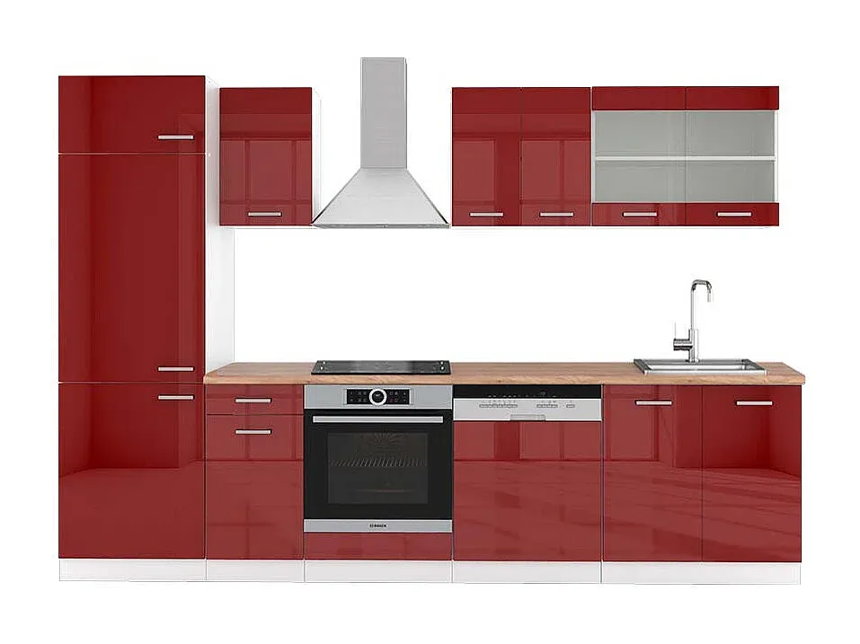 Küchenzeile in Hochglanz Rot und Weiß, Maße: 300x60x81.6 cm.