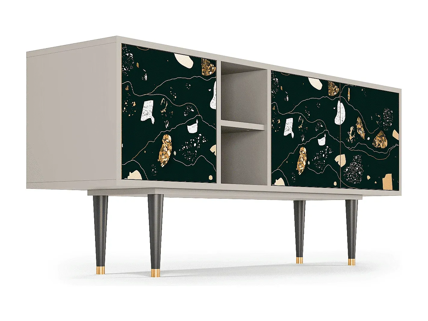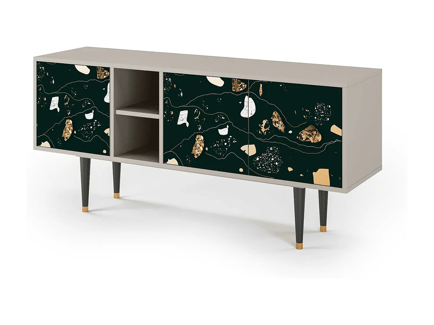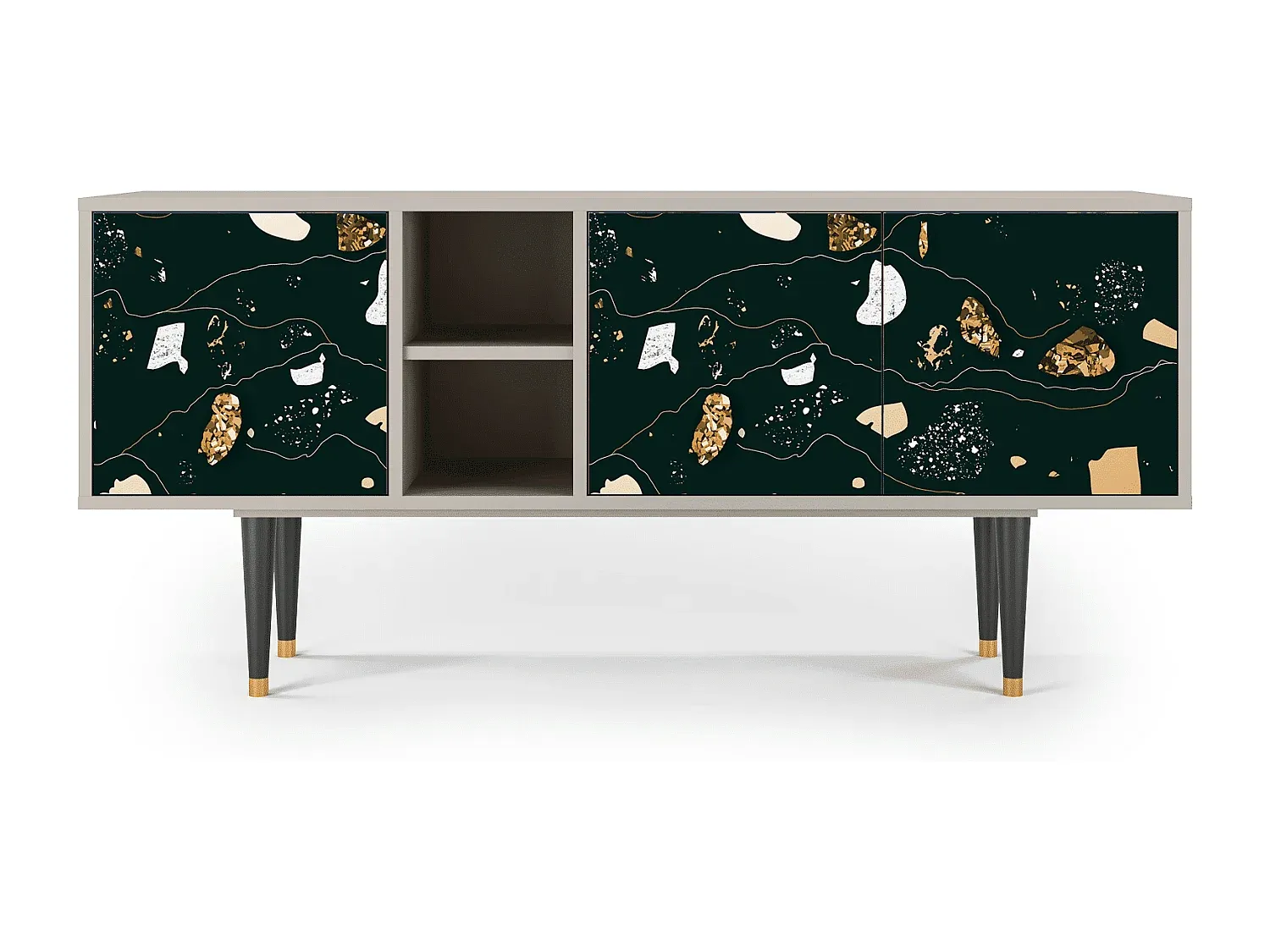 Der T5 bietet vielseitigen Stauraum mit einem schlichten Design, das sich in verschiedene Wohnstile einfügt. Die präzise gefertigten Fronten sind mit UV-Druck versehen und die Oberfläche ist durch einen schützenden Lack versiegelt. Stabilität wird durch Holzbeine mit Metallelementen gewährleistet. Erhältlich in verschiedenen Farben und Designs, passt der T5 mit seinen Maßen von 150 cm Breite, 69 cm Höhe und 41 cm Tiefe in jedes Zuhause.
