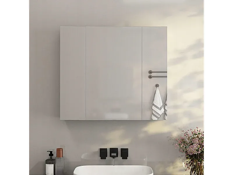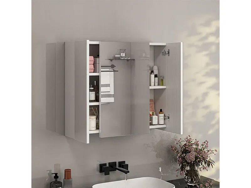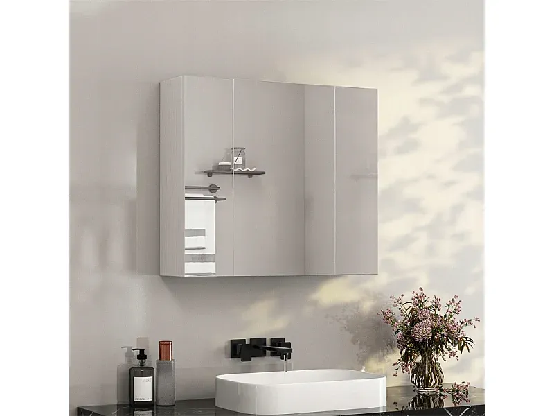 Hängeschrank für das Bad mit dreiteiligem Spiegel. Dieser Schrank mit 60 cm Breite bietet praktische Ablagen für Kosmetik, Medikamente und Hygieneartikel. Der dreiteilige Spiegel ermöglicht verschiedene Betrachtungswinkel. Die Konstruktion aus feuchtigkeitsbeständigen Materialien gewährleistet Langlebigkeit. Zur Wandmontage geeignet.