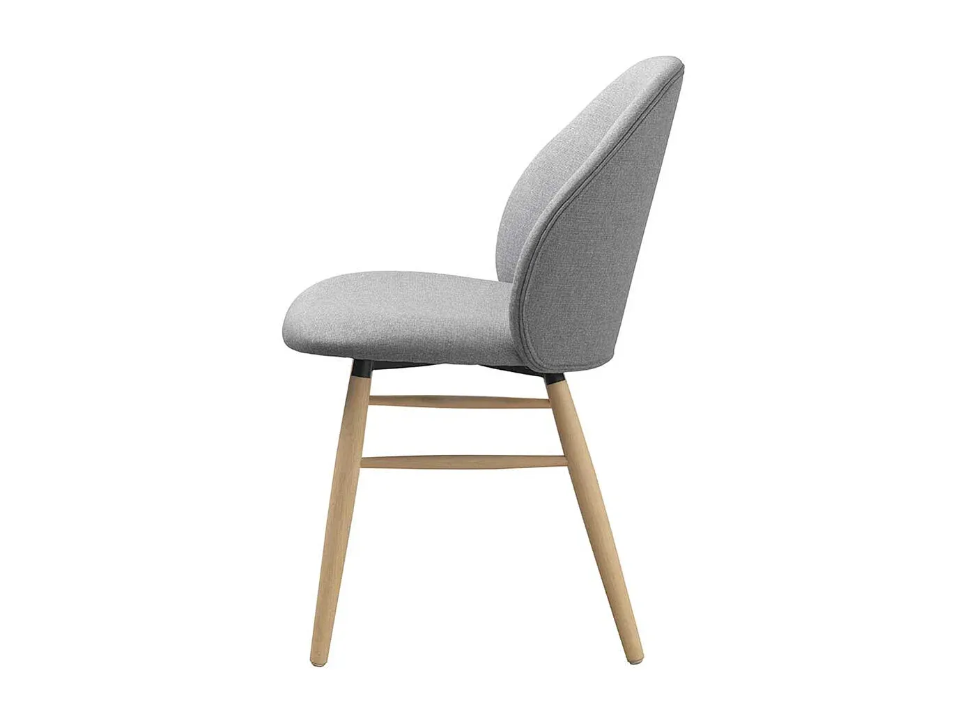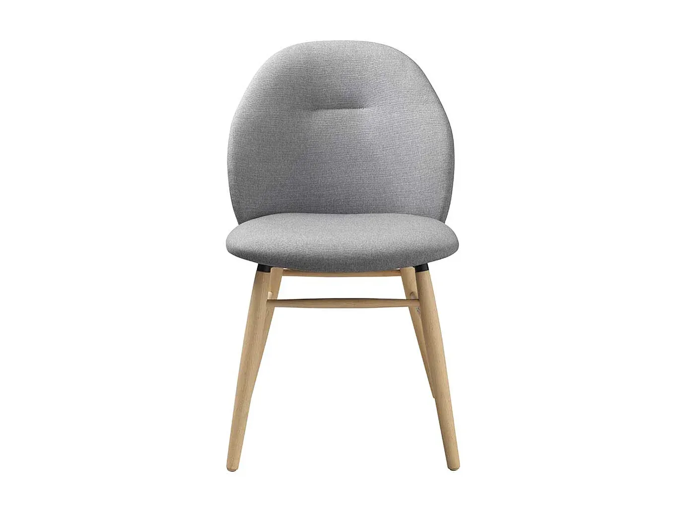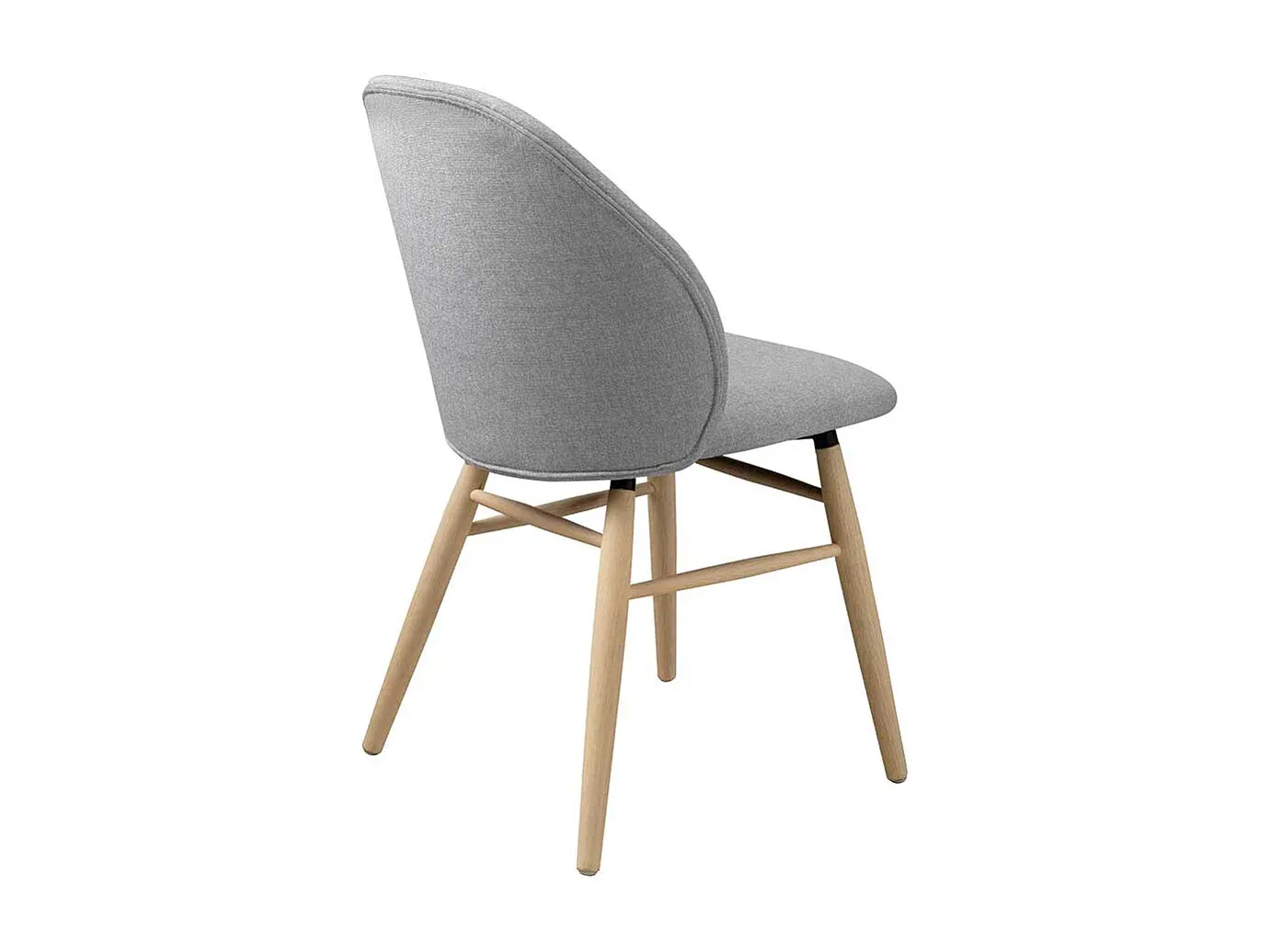 Esszimmerstuhl im skandinavischen Design aus Webstoff und Massivholz. Die Sitzbreite beträgt 48 cm, die Sitzhöhe 48 cm und die Sitztiefe 44 cm. Der Stuhl verfügt über Ziernähte und besteht aus einem Bezug mit einer Strapazierfähigkeit von 100.000 Scheuertouren nach Martindale. Der Stuhl ist in Hellgrau und Eichefarben erhältlich. Die Maße des Stuhls sind 50 cm breit, 84 cm hoch und 58 cm tief. Geeignet für den Innenbereich.