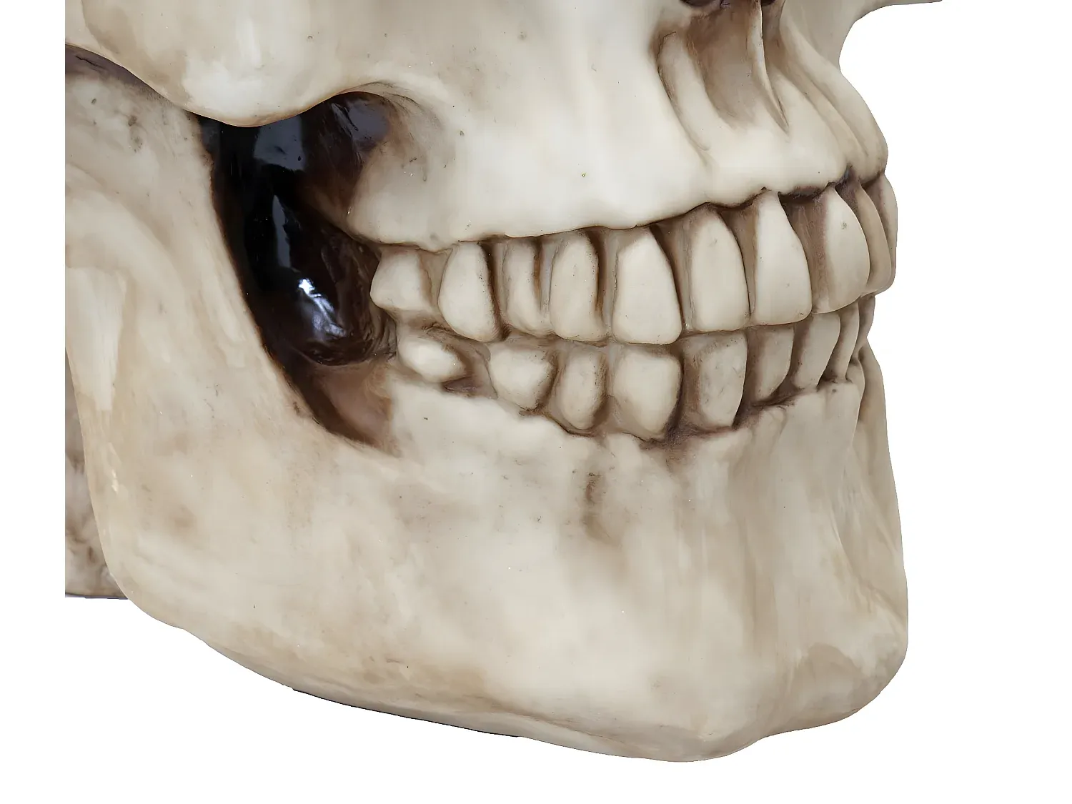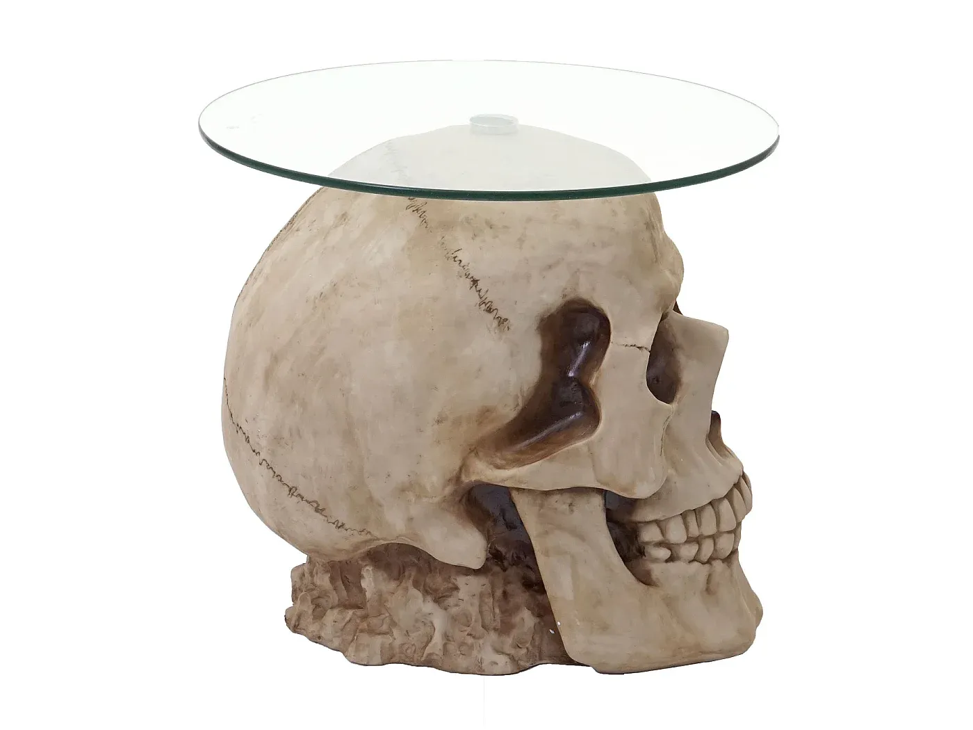 Beistelltisch mit einer Tischplatte aus Glas und einem Standfuß aus Polyresin, gefertigt in detailgetreuer Gestaltung. Bietet einen stabilen Stand durch den kunstvoll gearbeiteten Totenkopf. Polyresin ist widerstandsfähig gegen Bruch und witterungsbeständig bis -10° C. Maße: Höhe: 52 cm, Breite: 55 cm, Tiefe: 55 cm.