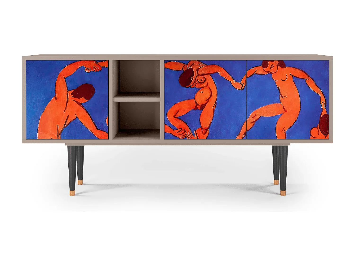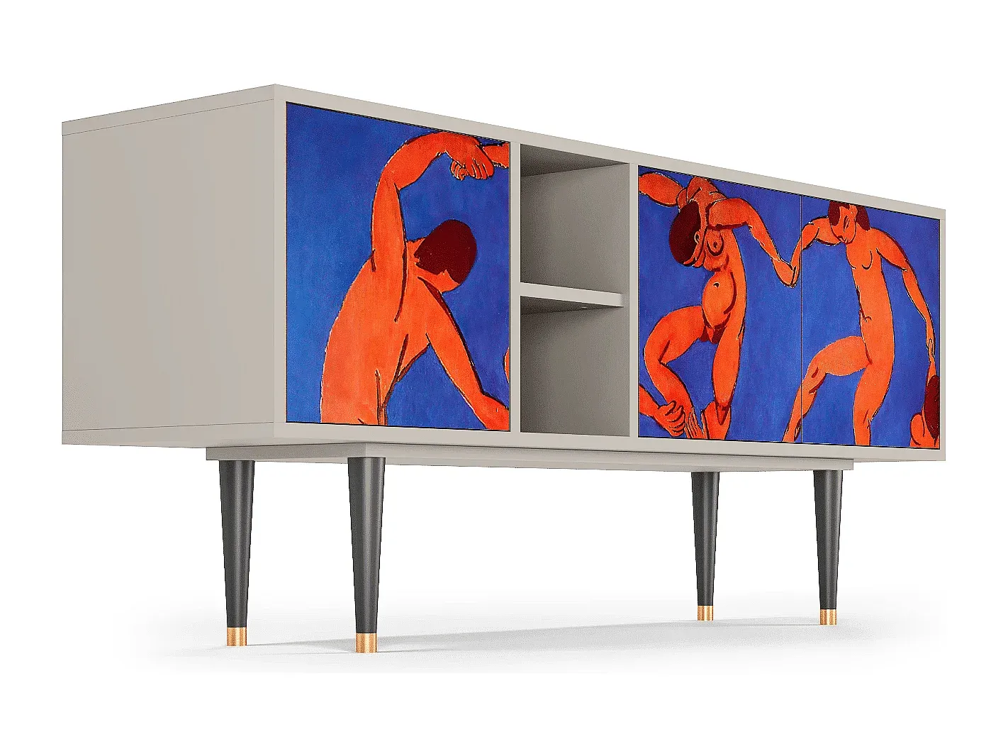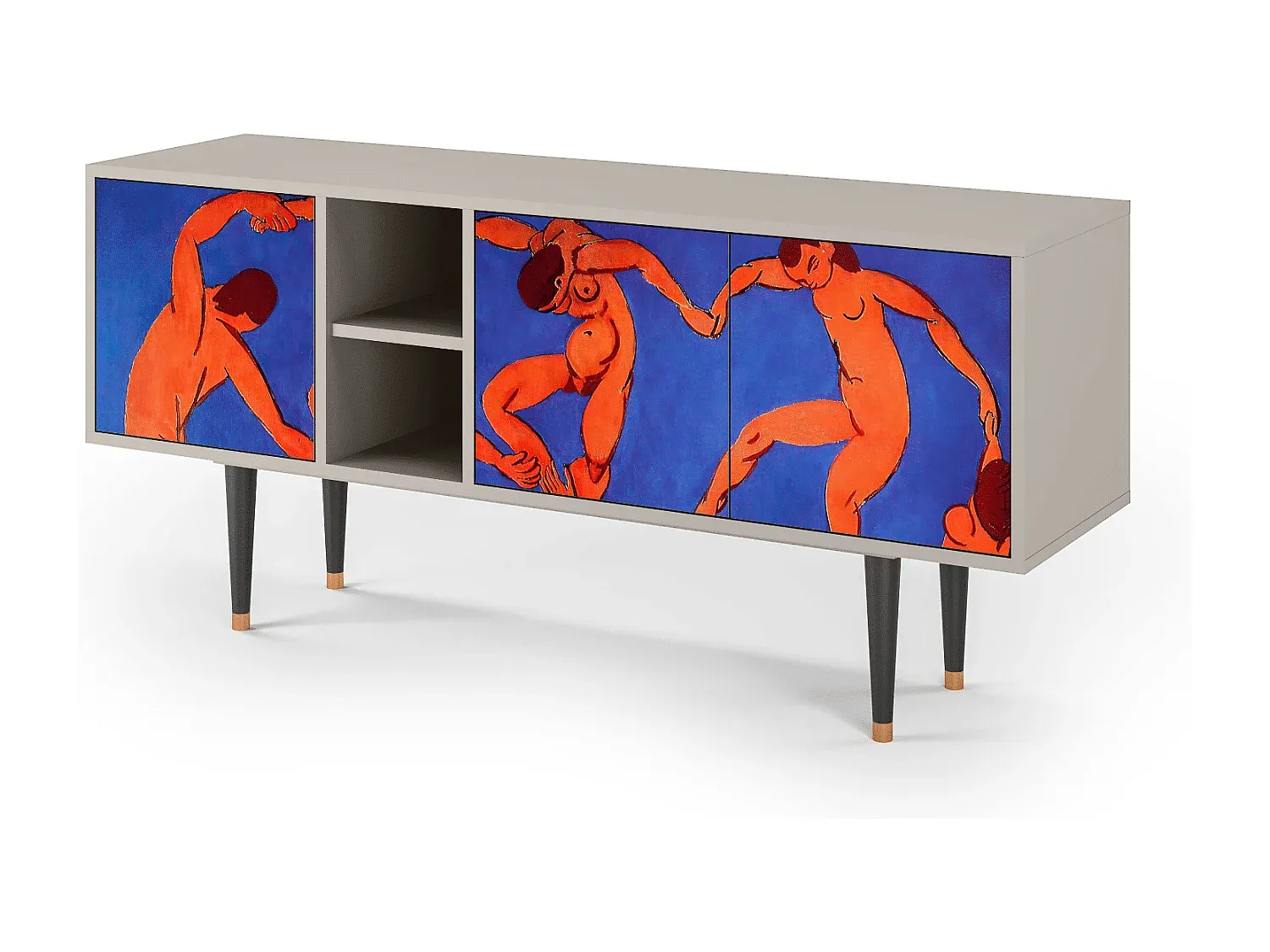 Der T5 bietet eine durchdachte Aufbewahrungslösung mit klarem Design, das sich in verschiedene Einrichtungsstile einfügt. Die Konstruktion ist sorgfältig gefertigt, mit hochwertigen Materialien wie Holzplatte und Holzderivaten. Der T5 verfügt über drei Türen und bietet ausreichend Platz für Stauraum. Die Oberfläche ist mit Laminat veredelt und widerstandsfähig gegen Kratzer und Verblassen. Er steht auf stabilen Holzbeinen mit Metallelementen und ist für eine Last von bis zu 60 kg ausgelegt. Maße: Breite 150 cm, Höhe 69 cm, Tiefe 41 cm.