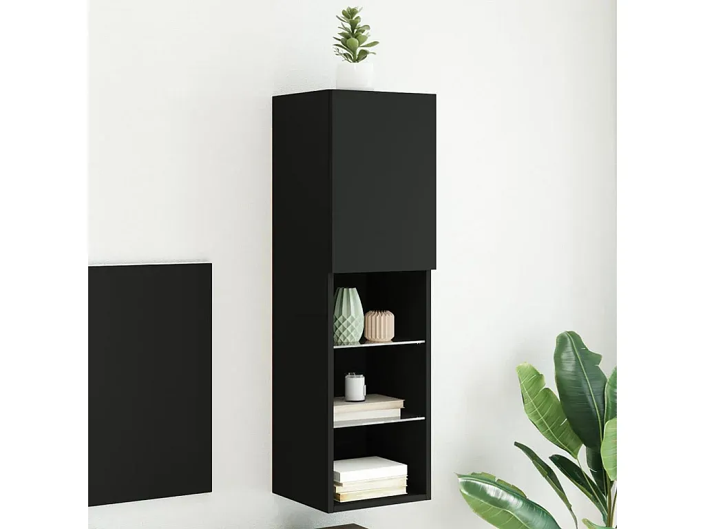 Dieser TV-Schrank bietet Funktionalität mit einem praktischen Design. Das Material aus Holzwerkstoff sorgt für Stabilität und Feuchtigkeitsbeständigkeit. Er bietet ausreichend Stauraum für Unterhaltungselektronik und Zubehör. Mit den integrierten RGB-LED-Leuchten können verschiedene Lichtfarben eingestellt werden. Der Schrank kann an der Wand montiert werden, um Platz im Raum effizient zu nutzen. Ein USB-Anschluss erfordert eine kompatible 5V-Stromquelle. Farbe: Schwarz. Material: Holzwerkstoff und Glas. Abmessungen: 30,5 x 30 x 102 cm. Zusammenbau erforderlich: Ja.