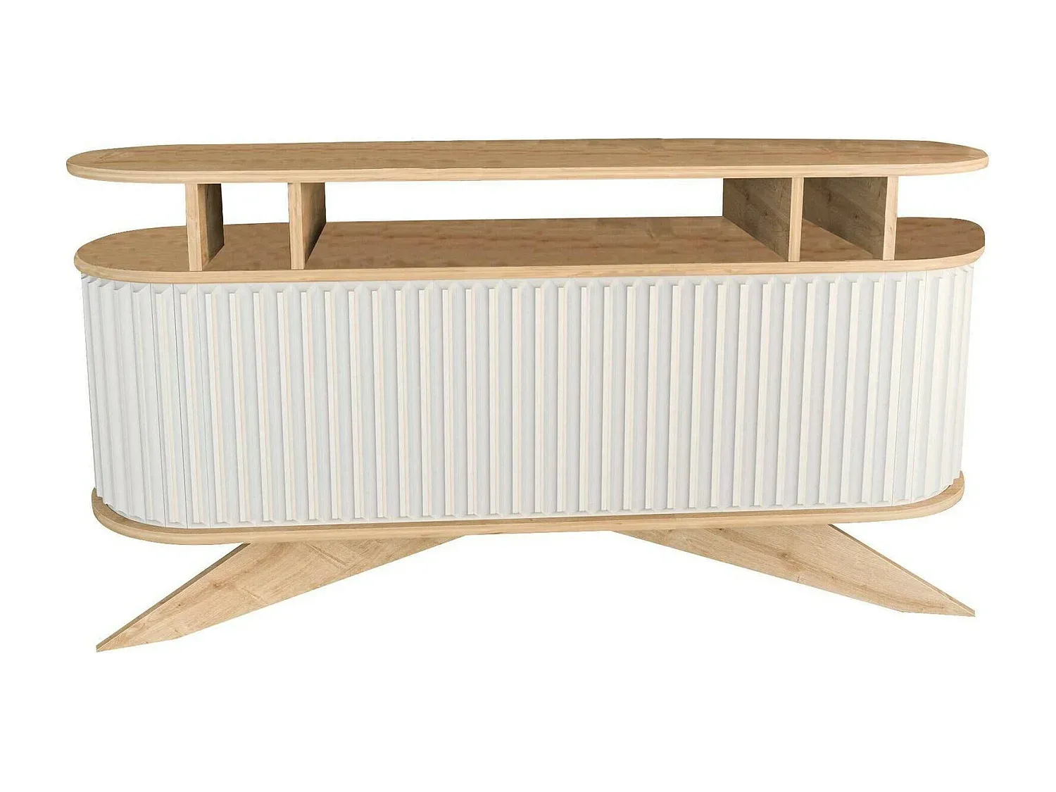 KOMMODE - Wohnzimmerbuffet, Wohnzimmer-Sideboard, Moderne Küchen-Speisekammer, 150x43h75 cm, Eiche und Weiß. Dieses vielseitige Möbelstück eignet sich für verschiedene Wohnbereiche wie Wohnzimmer, Flur, Eingangsbereich oder Büro. Es bietet reichlich Platz für Geschirr, Gläser, Tischdecken, Besteck, Bücher, Dokumente oder Dekorationsgegenstände. Hergestellt aus melaminbeschichteter Platte mit mattem Finish ist es einfach in verschiedene Einrichtungen integrierbar. Die Standardöffnung und der Schiebeverschluss erleichtern die Nutzung. Nicht als Raumtrenner geeignet. Abmessungen: Länge: 150 cm, Breite: 43 cm, Höhe: 75 cm