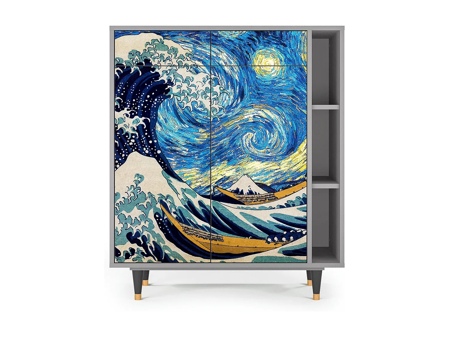 Dieses Möbelstück bietet nützliche Aufbewahrungsmöglichkeiten mit kompakten und leicht zugänglichen Schubladen zur Organisation von Gegenständen. Es verfügt über präzise gefertigte Fronten mit UV-Druck. Die Oberfläche ist versiegelt für Schutz gegen Kratzer und Verblassen. Die stabilen Holzbeine tragen zur strukturellen Festigkeit bei. Maße: Breite: 96 cm, Höhe: 110 cm, Tiefe: 41 cm. Die Farbe ist Grau, hergestellt aus Holzplatte und Holzderivaten. Es hat 2 Schwingtüren und ist zur Bodenaufstellung vorgesehen. Die maximale Traglast beträgt 60 kg und es ist zum Selbstaufbau gedacht.