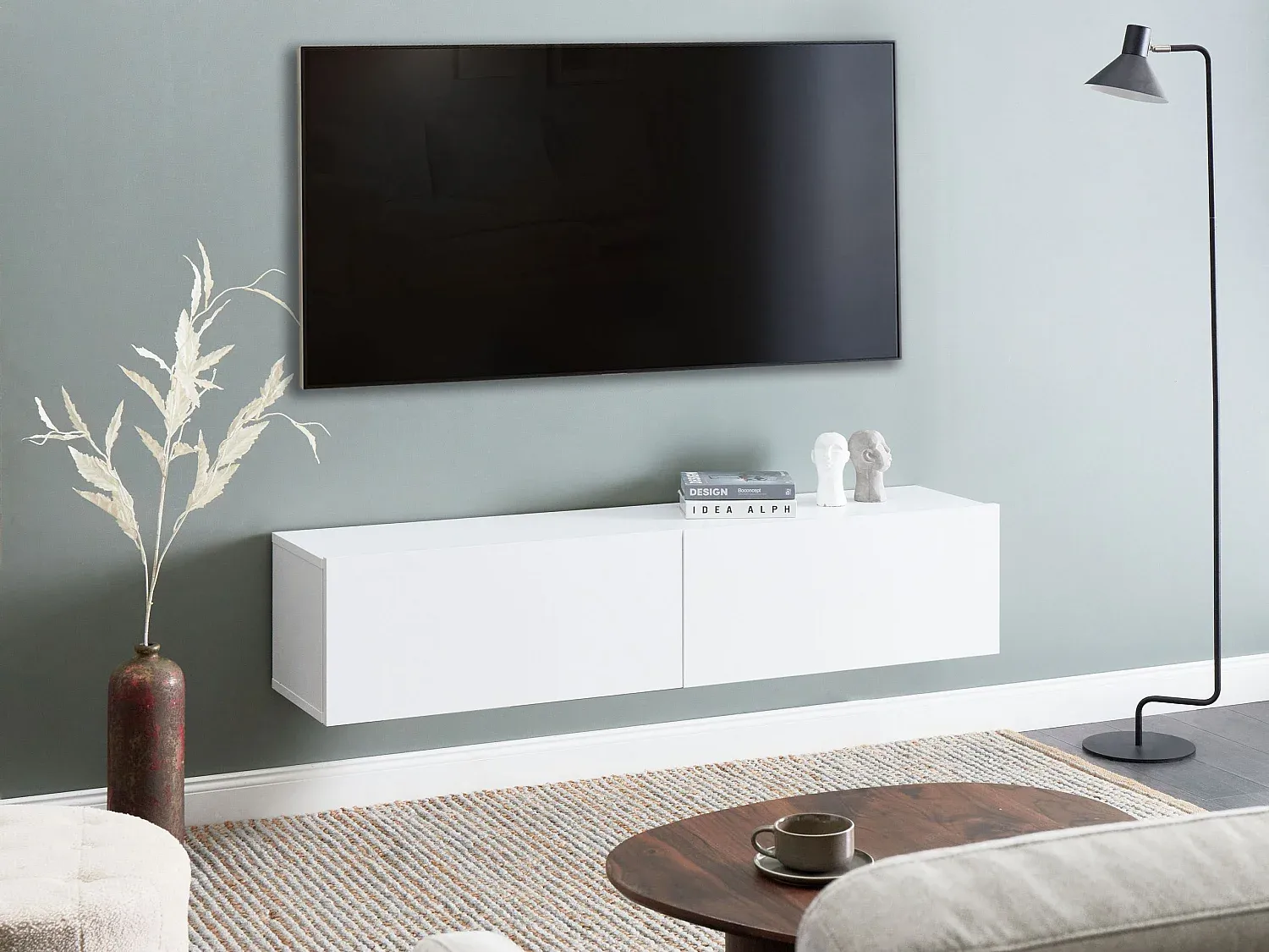TV-Hängeschrank mit 2 Klapptüren, ideal zur Ergänzung der Fernsehwand. Montierbar an jeder gewünschten Höhe. Robuste Konstruktion bietet Platz für Geräte bis zu 70 Zoll. Melaminbeschichtung schützt vor Kratzern. Zwei geschlossene Fächer für ordentliches Verstauen von Elektronik und anderen Gegenständen. Einfarbige Optik und grifflose Fronten schaffen modernen Look.