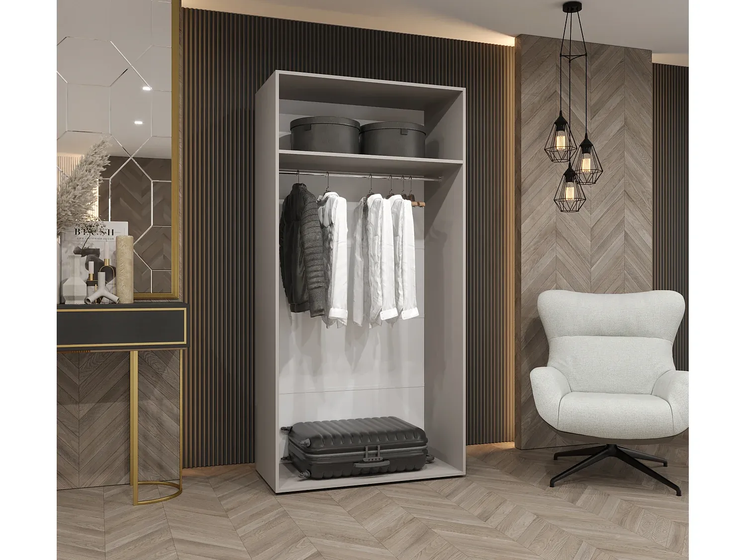 Dieser Schrank bietet Funktionalität für den täglichen Gebrauch. Die minimalistische Form wird durch einen schrägen Griff unterbrochen. Die Fronten sind CNC-gefräst. Die Farbauswahl ermöglicht eine Anpassung an verschiedene Einrichtungen und Räume wie Wohnzimmer, Schlafzimmer und Flur. Der Schrank besteht aus 16 mm starker laminierter Möbelplatte, die Kanten sind mit PVC-Folie versehen. Er verfügt über gefräste Fronten, Metallgriffen in verschiedenen Farben, eine Metallstange und Flügeltüren mit Soft-Close-Funktion. Fachböden sind fest verschraubt. Elemente des Schranks sind über Exzentergelenke verbunden, die Rückseite besteht aus HDF-Platte.