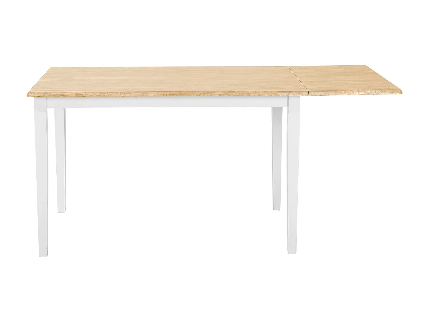 Esszimmertisch mit klappbarer Tischplatte aus Gummibaumholz. Der Tisch kann durch das klappbare Seitenteil erweitert werden. So lässt sich der Tisch je nach Bedarf anpassen. Die Tischbeine sind weiß lackiert und bieten einen Farbkontrast zur natürlichen Holzplatte. Geeignet für verschiedene Räume wie Esszimmer, Küche oder Arbeitszimmer.