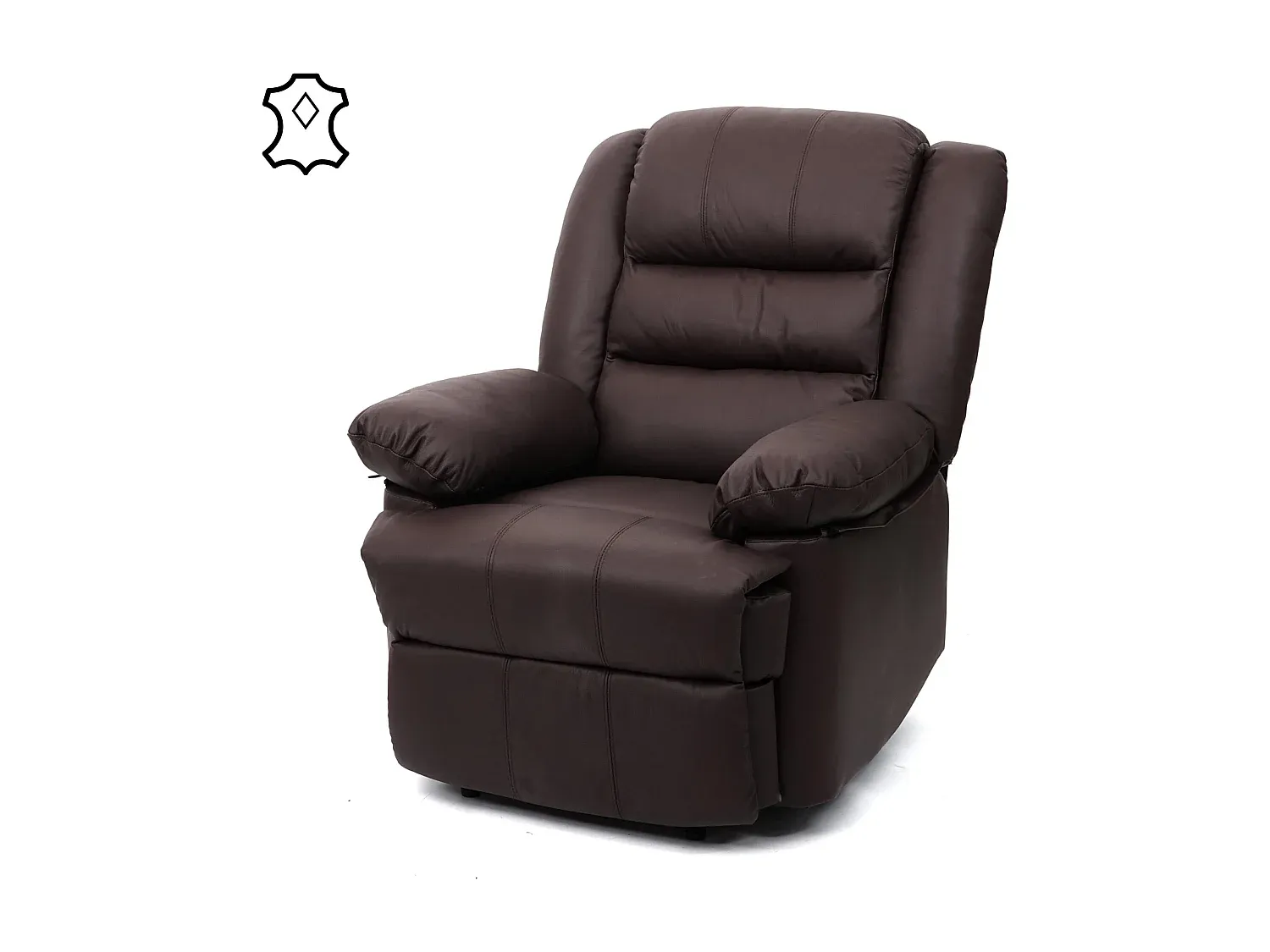 Dieser Fernsehsessel bietet eine großzügige Liegeposition und verstellbare Fußstützen. Die Rückenfläche kann durch Gewichtsverlagerung angepasst werden. Die Kontaktflächen bestehen aus beschichtetem Spaltleder, was gegen Schmutz und Nässe schützt. Kunstleder wird für die Seitenteile und das Hinterteil verwendet. Der Sessel besitzt eine hohe Rückenlehne und eine hochklappbare Fußablage. Maße: Gesamthöhe 101 cm, Gesamtbreite 87 cm, Gesamttiefe 100 - 150 cm, Sitzhöhe 48 cm, Sitzbreite 50 cm, Sitztiefe 57 - 98 cm, Rückenlehnehöhe (vom Sitz aus gemessen): 60 cm, Armlehnehöhe (vom Sitz aus gemessen): 18 cm, Breite Armlehne: 25 cm.