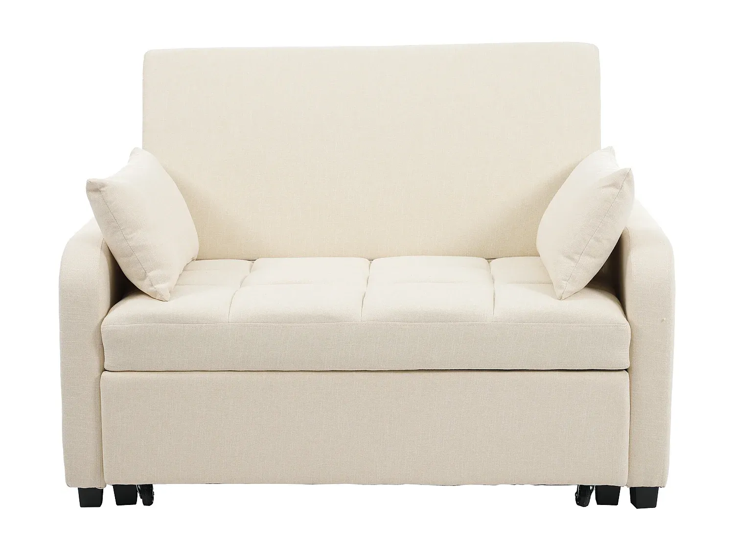 Dieses Sofa lässt sich einfach in ein Bett umwandeln und bietet eine bequeme Sitz- und Liegefläche. Der Bezug besteht aus atmungsaktivem Baumwoll- und Leinenstoff. Die Schaumstoffpolsterung bietet Komfort beim Sitzen oder Liegen. Der Rahmen aus Holz und Metall gewährleistet Stabilität. Durch das klappbare Design und die verstellbare Rückenlehne ist es platzsparend und passt in kleinere Wohnungen.